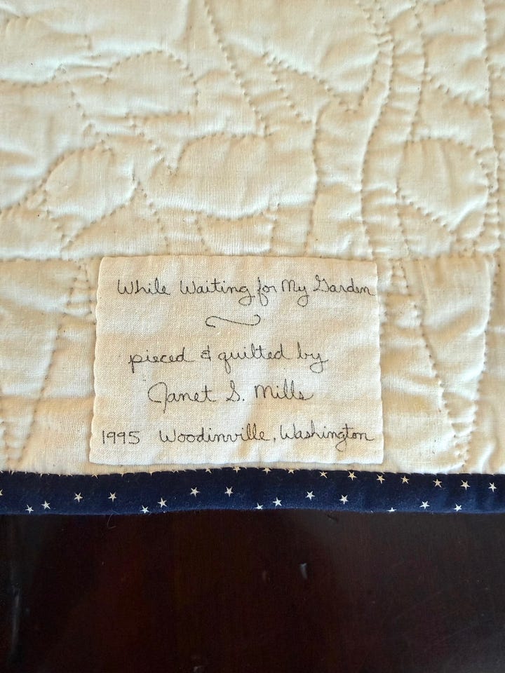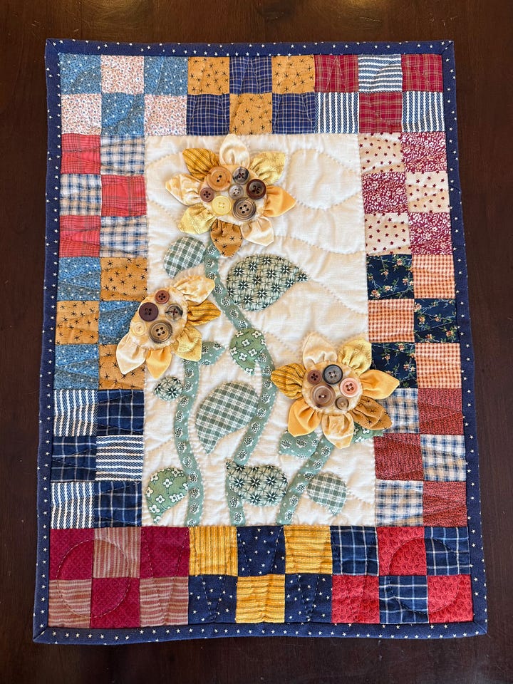I have a small quilt featuring a trio of sunflowers that my mother made in 1995. She named it “While Waiting for My Garden”—a nod to the raised beds she was always asking my father to build in the backyard of my childhood home. He never got around to it, and starting in 1996, we bounced from house to house before finally landing in that too-small apartment with no yard at all.
