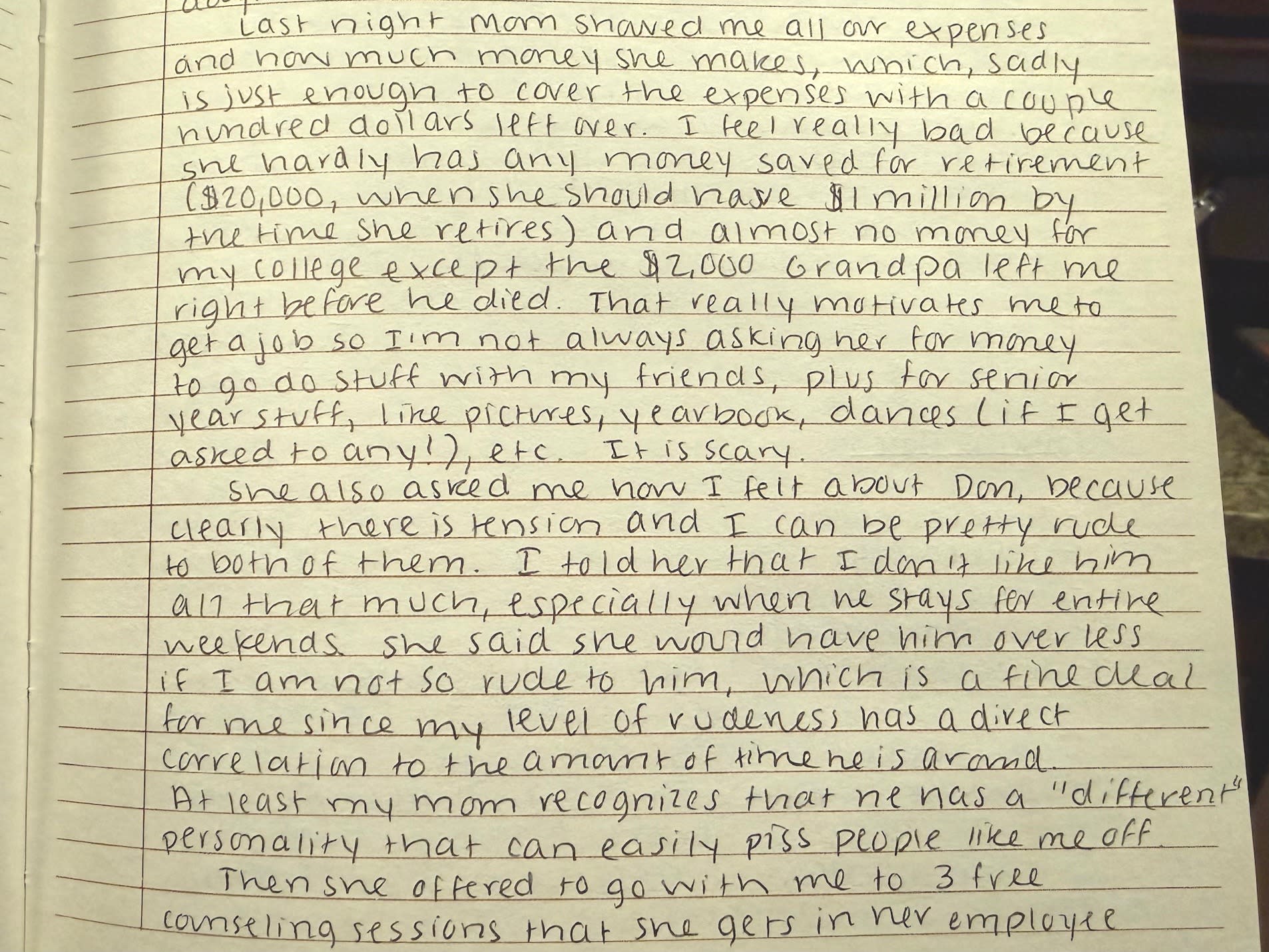 Two months into my mother and Don dating, she proposed we go to family counseling to work through our issues. Don thought my distaste for him was a classic one: “You’re not my father!” But for me, it was truly a mismatch of personalities. He was a bull in the china shop of teenage girlhood. Tact was not in his toolbox, and he couldn’t understand why logic and rationality didn’t work to deal with a person whose wildly fluctuating hormones bypassed those virtues entirely.